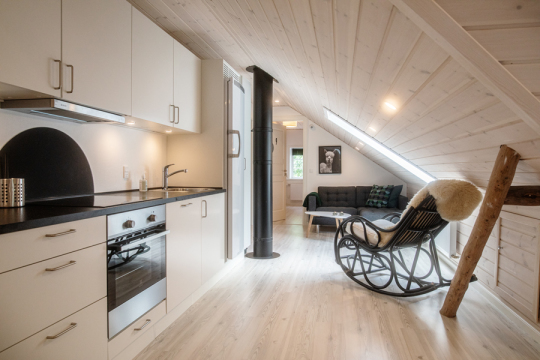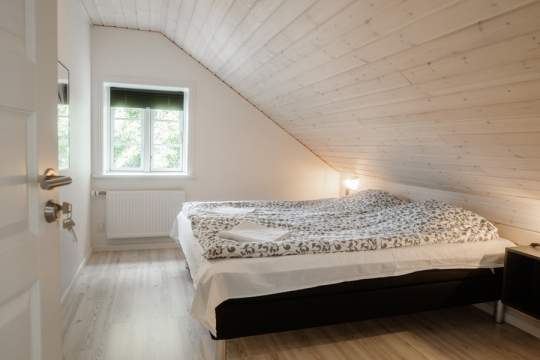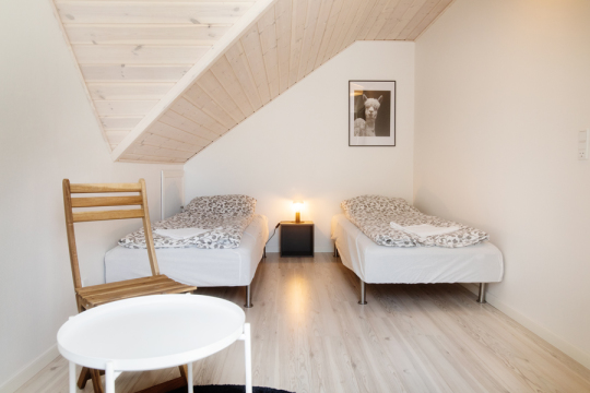 Ligger på første sal med egen indgang. Her er der en lejlighed med tre dobbeltværelser samt ét bad og toilet. Der er veludstyret køkken i lejligheden med blandt andet køleskab, komfur, kaffemaskine, mikroovn og spisebord. Desuden hyggekrog med lille sofa.